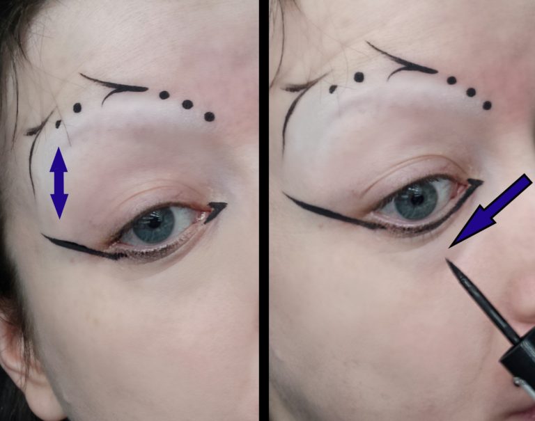 Seeing as we are doing the liner on both bottom and top lids, draw a V where the eyeliner will meet in the corner of your eye.