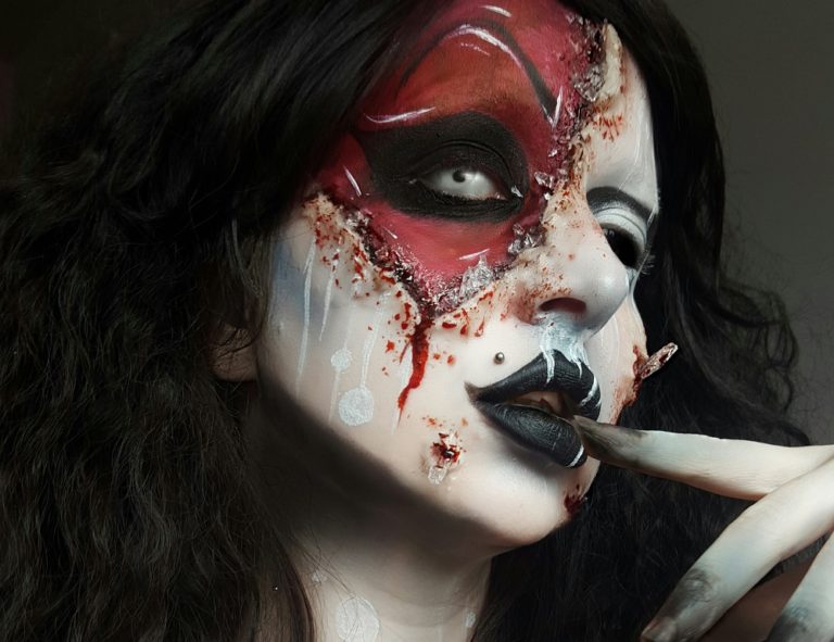 5. Finish off your beauty makeup of your choosing.  Here I have used Eyeshadow’s for a eye contour , black and white liner on the bottom lid and Black hole for the lips. Though I used the black paradise paints on the demon eye and blended out a little (also for the brow too )