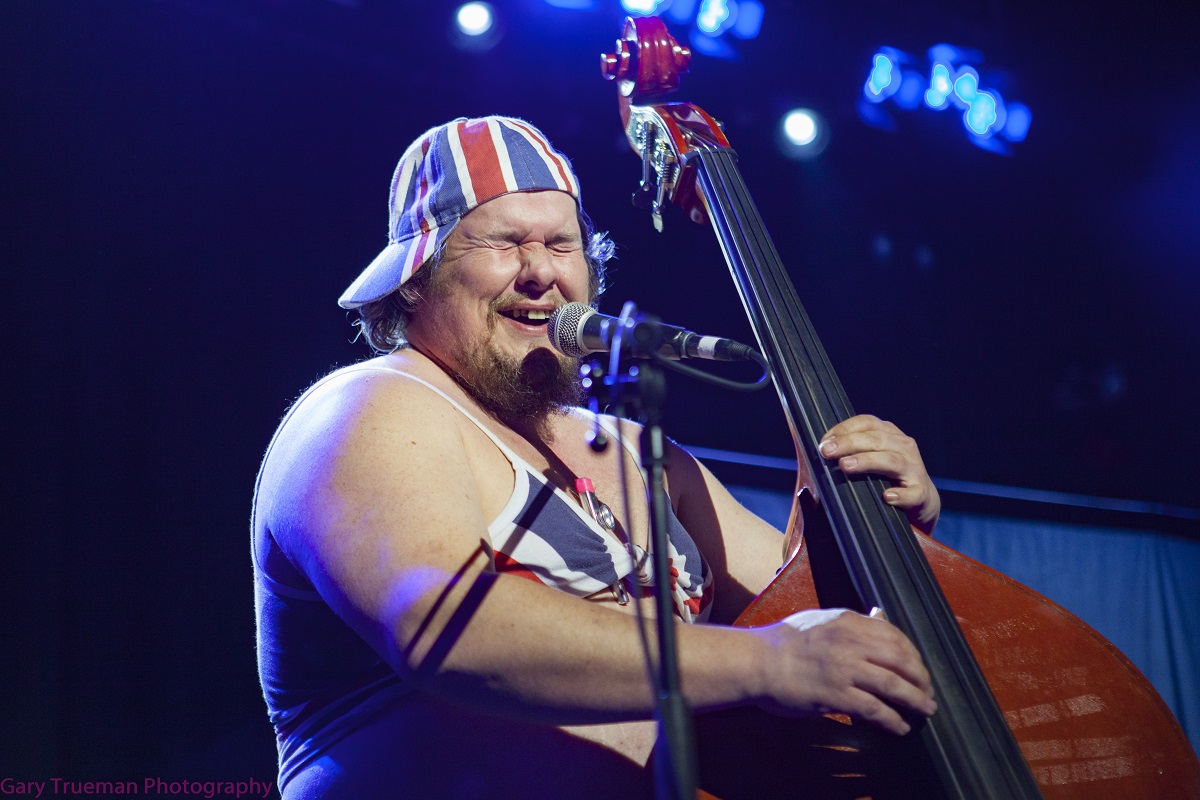 Lounge Kittens long time friend Grant Sharky mixes comedic observations with political and social commentary in an easy and pleasant way. He certainly knows how to capture an audience and then hold on to them. His double bass playing may only be secondary to the acerbic lyrics but he knows how to get his groove on, even if at one point it’s too good to play and sing at the same time, something it should be added that’s all part of the show. We get a brave costume change, a token bloke joke, and a set of songs that warm things up very nicely. Well suited to fringe events Grant Sharky performs the kind of act that would go down very well in the night time entertainment tents some of the big festivals have. Download are you listening?