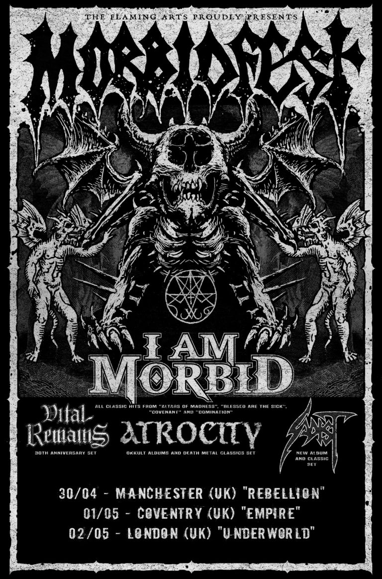 The Flaming Arts Agency has revealed a long-awaited show list for all European extreme metallers. At the end of April 2019, MORBIDFEST is kicking off on an EU & UK tour with a blasting line-up consisting of I AM MORBID (USA), ATROCITY (DE), VITAL REMAINS (USA), and SADIST (IT). All four bands have prepared unique sets for this tour to make it even more special. Opening acts and special guests for the shows to be announced soon.