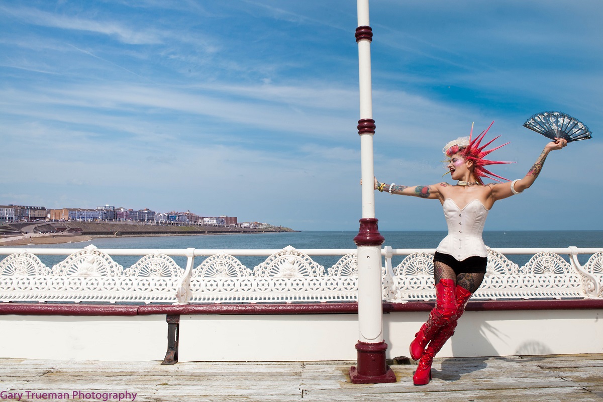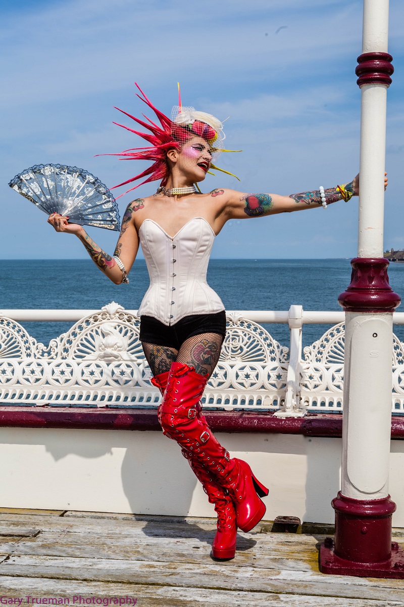 Let’s talk about that amazing hair style. You do pin up and punk modelling and your hair style you wear on stage that you also wore for our photo shoot is a mix of liberty spikes and pin up curls. That must be unique. Have you ever seen anybody else wear their hair that way before?