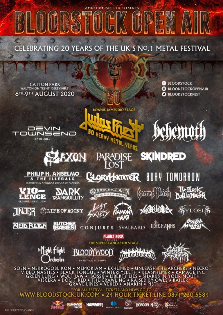 BLOODSTOCK’s 2020 main stage headliners are DEVIN TOWNSEND (Friday), BEHEMOTH (Saturday), and JUDAS PRIEST (Sunday). The festival also features sets from HATEBREED, PHILIP H. ANSELMO & THE ILLEGALS, SKINDRED, PARADISE LOST, LIFE OF AGONY, BURY TOMORROW, BLACK DAHLIA MURDER, DIAMOND HEAD, JINJER, VIO-LENCE, SACRED REICH, GLORYHAMMER, DARK TRANQUILLITY, BUTCHER BABIES, CATTLE DECAPITATION, BLOODYWOOD, MEMORIAM, RAMAGE INC, GREEN LUNG, BOSSK, CONJURER, ORANGE GOBLIN, THE NIGHT FLIGHT ORCHESTRA, UNLEASH THE ARCHERS, SAXON, SYLOSIS, TOXIC HOLOCAUST, NECTOR, WINTERFYLLETH, EXHUMED, NEKROGOBLIKON, THE CRAWLING, RAISED BY OWLS, ANAKIM, ACID REIGN, SVALBARD, IDLE HANDS, SOEN, VISCERA, DOG TIRED, BAILER, SAVAGE MASTER, BLASPHEMER, BLACK TONGUE, LIBERTY LIES, PIST, & SHARKS IN YOUR MOUTH so far. Many more bands performing over the weekend are still to be announced! Unsure what to expect? Watch a trailer all about BLOODSTOCK here.