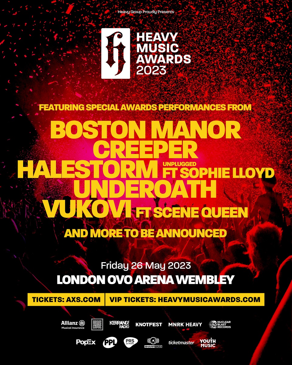 Heavy Music Awards have announced its first wave performers and hosts for the historic 2023 event, set to take place at OVO Arena Wembley on 26 May 2023. Renowned for showcasing the diverse global icons of heavy music at the annual event, this year will welcome unique and special performances from some of the most exciting names in the scene. With a location upgrade to OVO Arena Wembley, the celebrated venue will recognise the growing impact of heavy music, highlighting both breakthrough artists and stalwarts of the scene. Pre-sale tickets are available to voters and general sale tickets available Wednesday 19th April at 10am, starting at just £25 (plus fees), which are on sale here.
