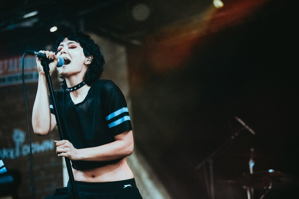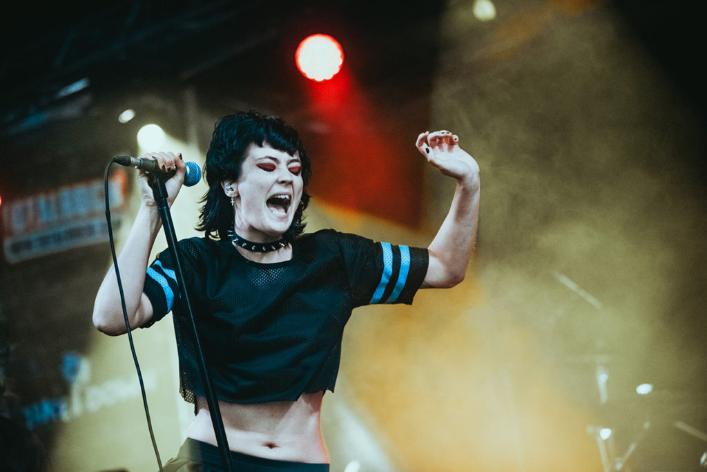 The courtyard fills up nicely and there is a buzz of electricity in the air. It’s an intense encounter from the get go as singer Kitty Austen prowls the stage back and forth before exploding into a frenzied setlist of angst fueled industrial punk rock and its one hell of a tasty concoction. With scream along choruses and thunderous basslines with songs like ‘Repent’ ‘Daughter Of Lucifer’ and finale ‘Middle Finger’ it’s easy to see why these guys are making a big noise right now and a vigorous cover of ‘Firestarter’ slides perfectly into the set. With a new album being released this summer Saint Agnes need to be on your ones to watch list.