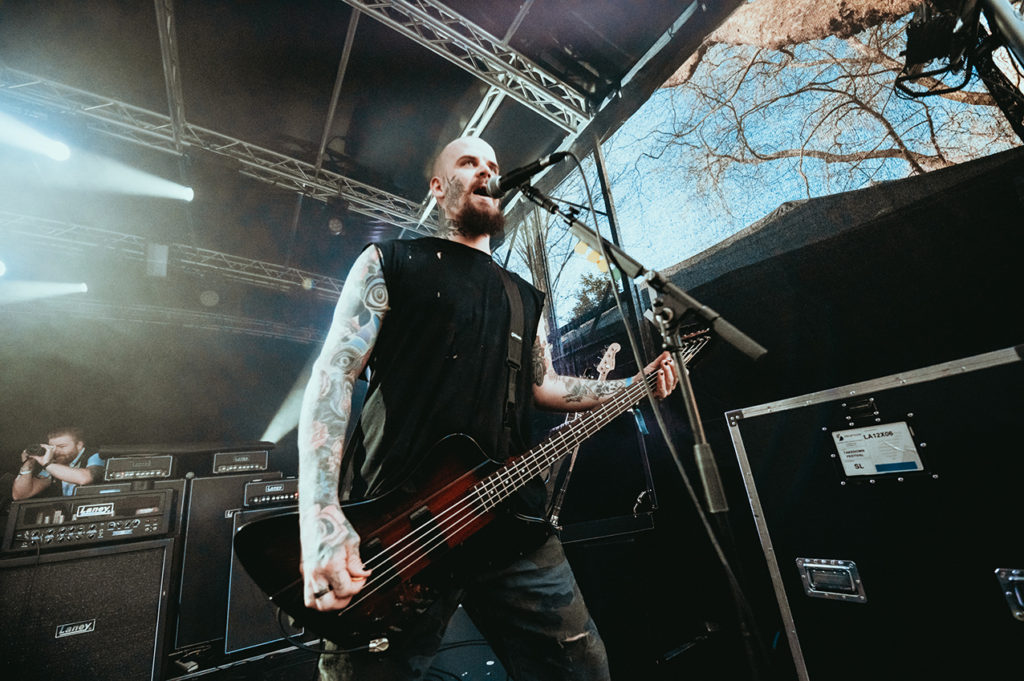 The Portsmouth Guildhall is one of those locations that seems perfect for a festival with multiple stages. From the main stage both the Out Of Line stage and the Down For Life Music stage are just a couple of steps away, either side of the venue. The Total Rock stage outside is a short walk out the side exit next to the Out Of Line stage main door. With the sun shining it’s also not too cold, despite the early April chill and the sound on the outdoor stage sounds amazing. With the area protected on one side by the Guildhall there’s no wind to speak of to whip the sound away. With a good mix of pop punk, tech metal, and heavy metal there’s always something for even the most discerning of music fans to listen to.