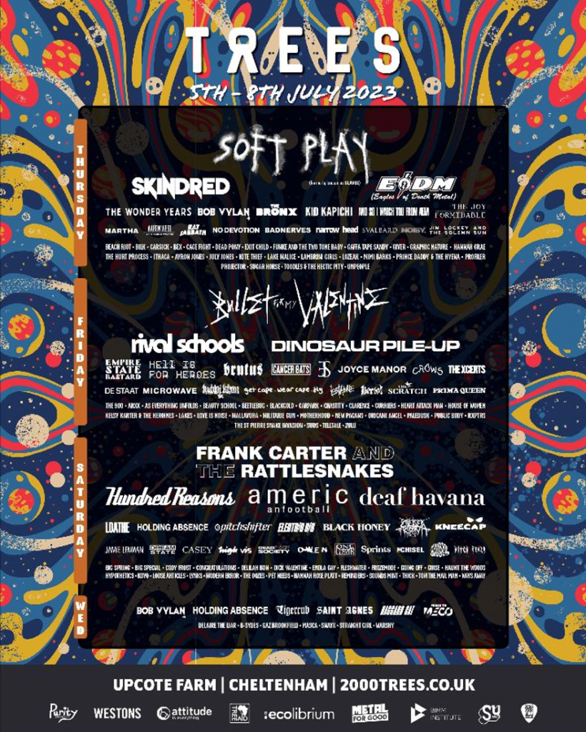 Frank Carter & the Rattlesnakes / Hundred Reasons / Deaf Havana / American Football / Loathe / Jamie Lenman/ Holding Absence / Pitchshifter / Electric Six / Black Honey / Chelsea Grin / Kneecap / Dream State / Casey / High Vis / Dead Poet Society / Owen / One Step Closer / Sprints / The Chisel / Chubby & the Gang / Witch Fever / Big Spring / Cody Frost / Congratulations / Delilah Bon / Dick Valentine / Enola Gay / Fleshwater / Frozemode / Going Off / GUISE / Haunt the Woods / Hypothetics / Koyo / Loose Articles / Lynks / Modern Error / The Oozes / Pet Needs / Hannah Rose Platt / PROJECTOR / Reminders / Sounds Mint / THICK / Tom The Mail Man / Ways AwayTICKETS HERE / 2000Trees Festival Information