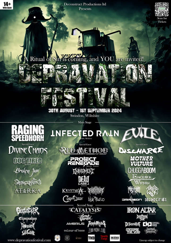 Following an outstanding Debut year, Depravation Festival has released the full lineup for 2024. The announcement includes the likes of headliners Raging Speedhorn, Infected Rain, and Evile along with special guests Discharge, Red Method, Divine Chaos, and many more! This insane 40 band bill held in Swindon’s finest venue packs a massive punch for what is ultimately an intimate setting.