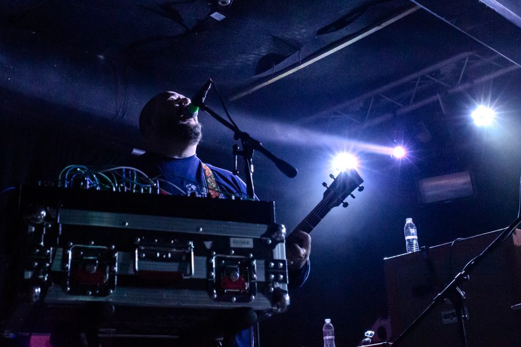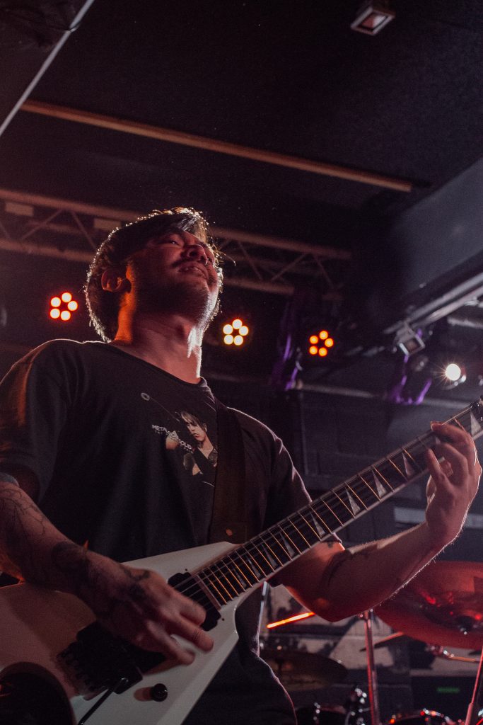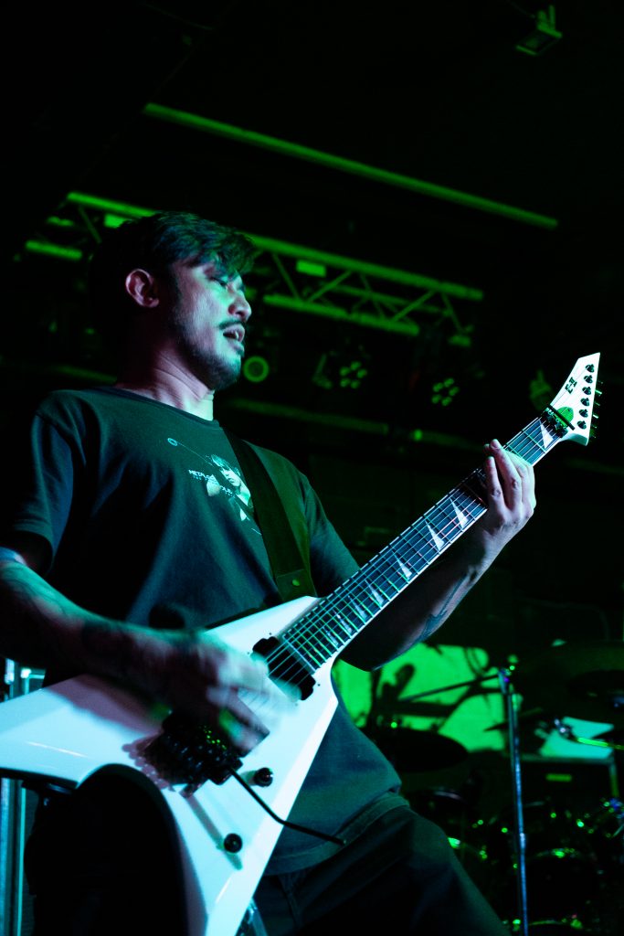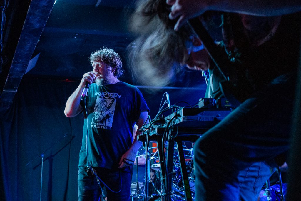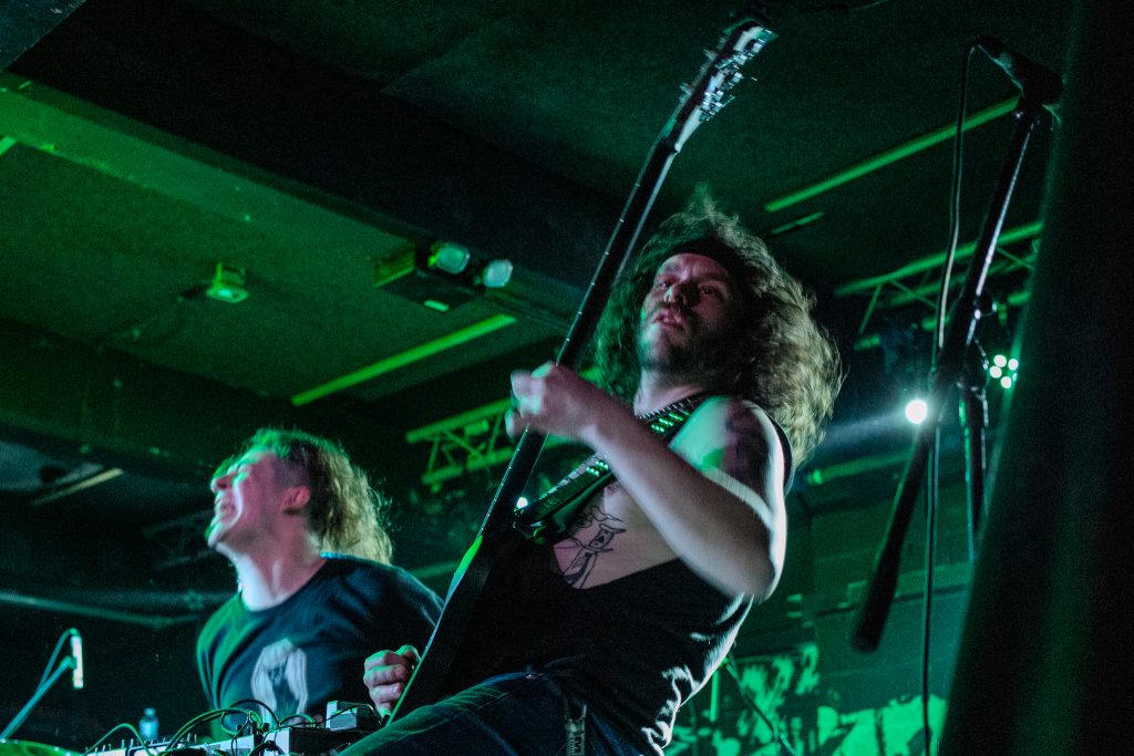 This band is on a mission to be as heavy and morose as possible! Employing power electronics, only the slightest in the way of lighting and flapping down-tuned strings, Primitive Man brings doom-laden noise for the oncoming apocalypse. Blast Beats are delivered in short bursts out of the mire for fleeting passages, seemingly to mirror the sparse rays of light scanning the room. The band truly makes Wormrot sound positively sing-along by comparison. It’s all excellent, of course, and we love a bit of drone doom noise, but damn, is it harrowing! Fractured, droning soundscapes rumble and hiss, and we’re feeling the total weight of their two ominous-looking flight cases; these cases presumably contain electronic torture devices that punish circuit boards until they scream in agony. Everything here is heavy, and Primitive Man appears to be operating a scorched earth policy with their dual-man mountain attack bookending their central drummer. This is not about songs; this is about levelling the place, and that’s a job well done tonight!