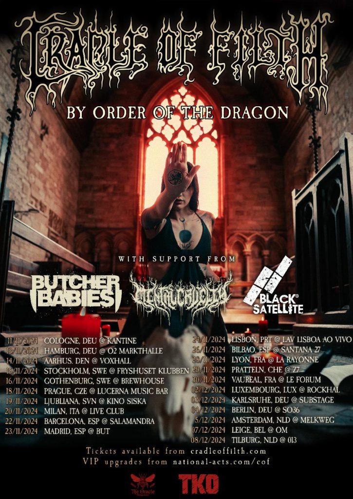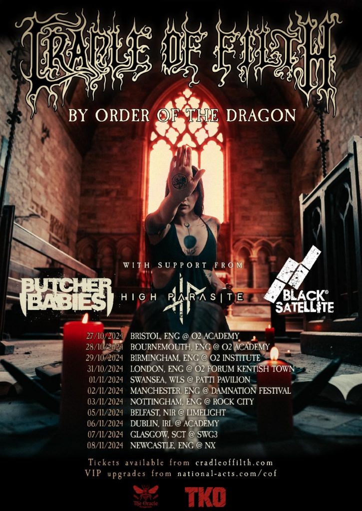Nothing kicks off the spooky season like a hellacious CRADLE OF FILTH live extravaganza and the band begin proceedings in Bristol on October 27th. The auspicious tour includes a spine-chilling evening at London’s O2 Forum Kentish Town on Hallowe’en itself. Joining the purveyors of pandemonium for UK & Irish shenanigans will be Butcher Babies, High Parasite, and hot newcomers Black Satellite – be sure to get there early! Mental Cruelty will take over for High Parasite on the European leg.