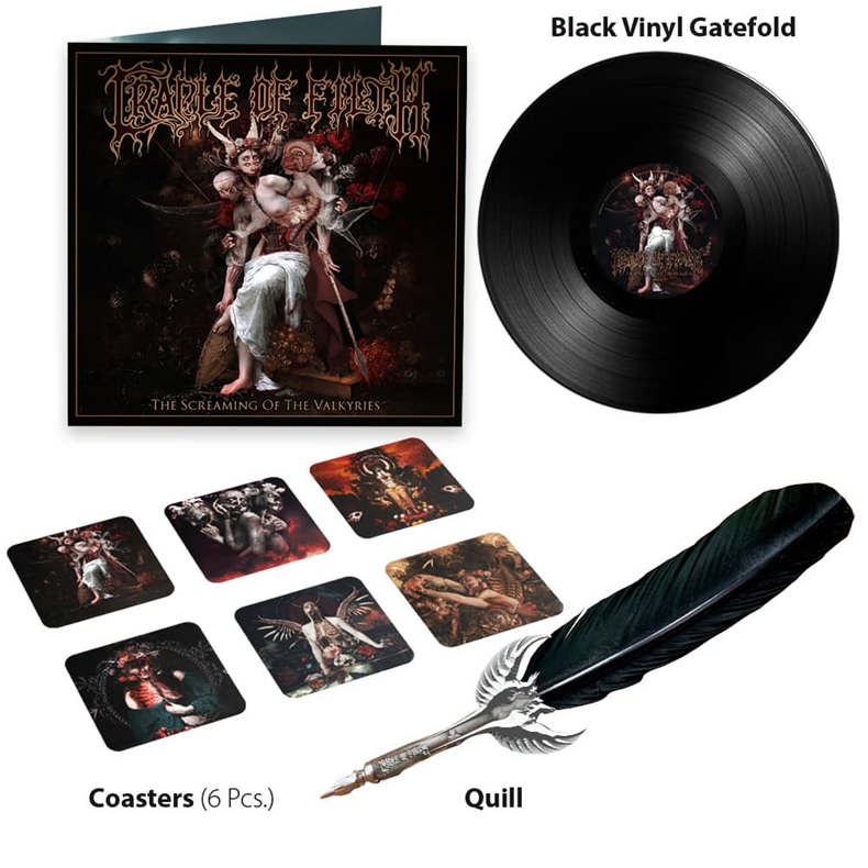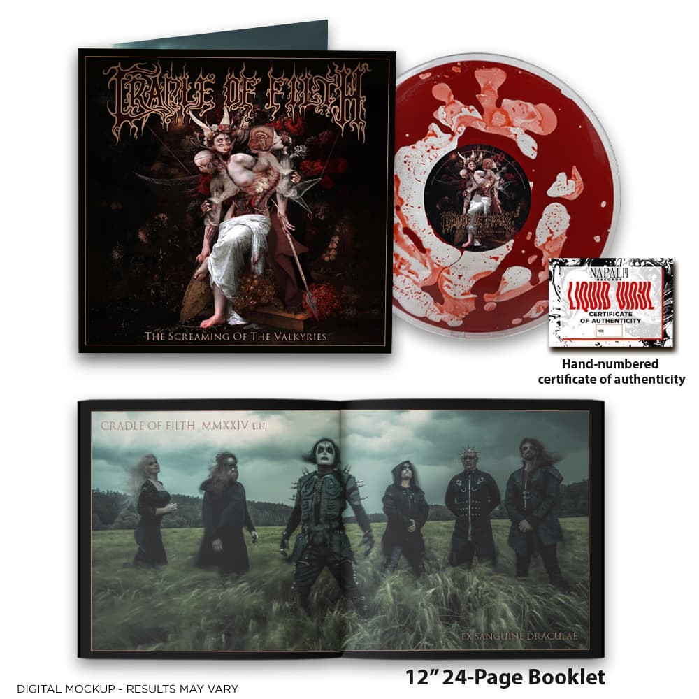 Produced, recorded, mixed and mastered by Scott Atkins at Grindstone Studios in Suffolk, England, The Screaming Of The Valkyries beckons the brave into a new era of CRADLE OF FILTH misadventure, celebrating melancholic melody, blackened thrash, and apocalyptic existential dread with a grinning smattering of unbridled revelry. The Screaming Of The Valkyries is a bloody, dark love letter to the longtime legion of CRADLE OF FILTH faithful and a stunning entryway for fresh lambs to the sonic slaughter.