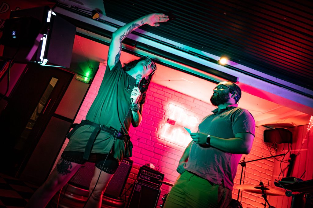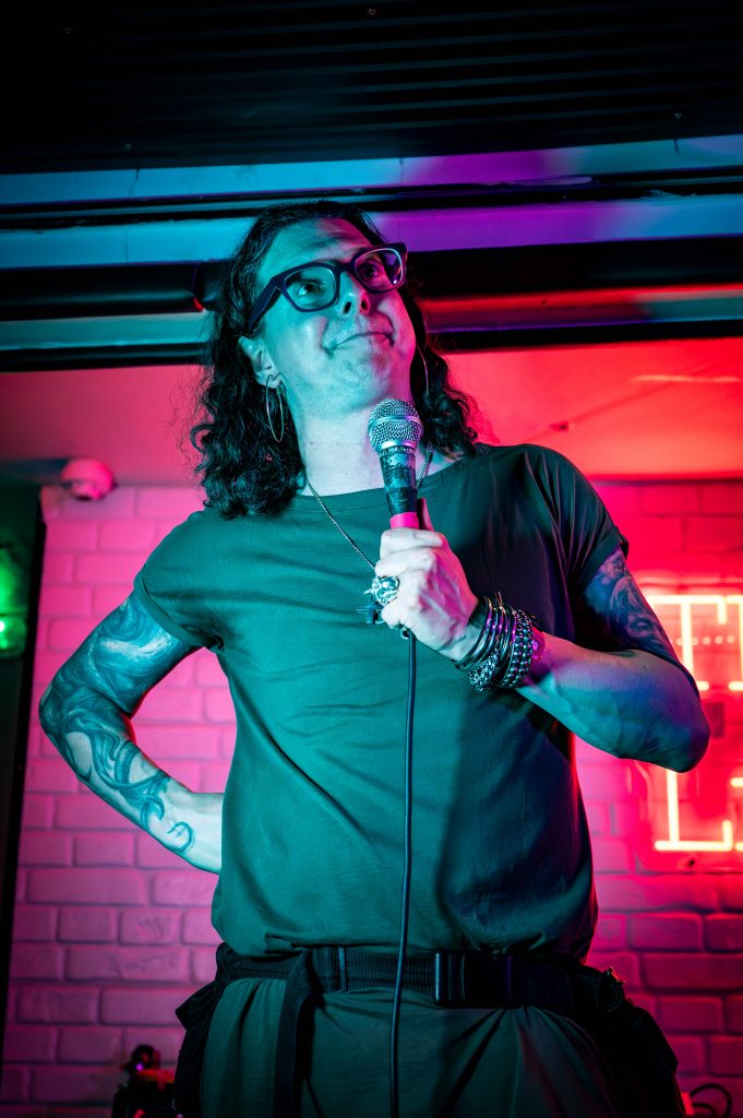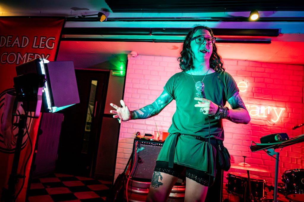 It’s another Dead Leg Comedy Club night with a twist. There are no other comedians on tonight’s bill as it’s a preview of Andrew’s latest comedy show. It must be stated that what’s being presented tonight is not the final show that will be seen in Edinburgh. Some of the jokes are less than a day old, having literally been written in the afternoon. It’s entirely possible that some will be written during the show. It’s Andrew O’Neill, anything is possible. For those who don’t know who Andrew O’Neill is, they are known for their radio and TV appearances, regular festivals, and their appearances in seasons 2 and 3 of Good Omens. They were also one quarter of the steampunk band The Men That Will Not Be Blamed For Nothing.